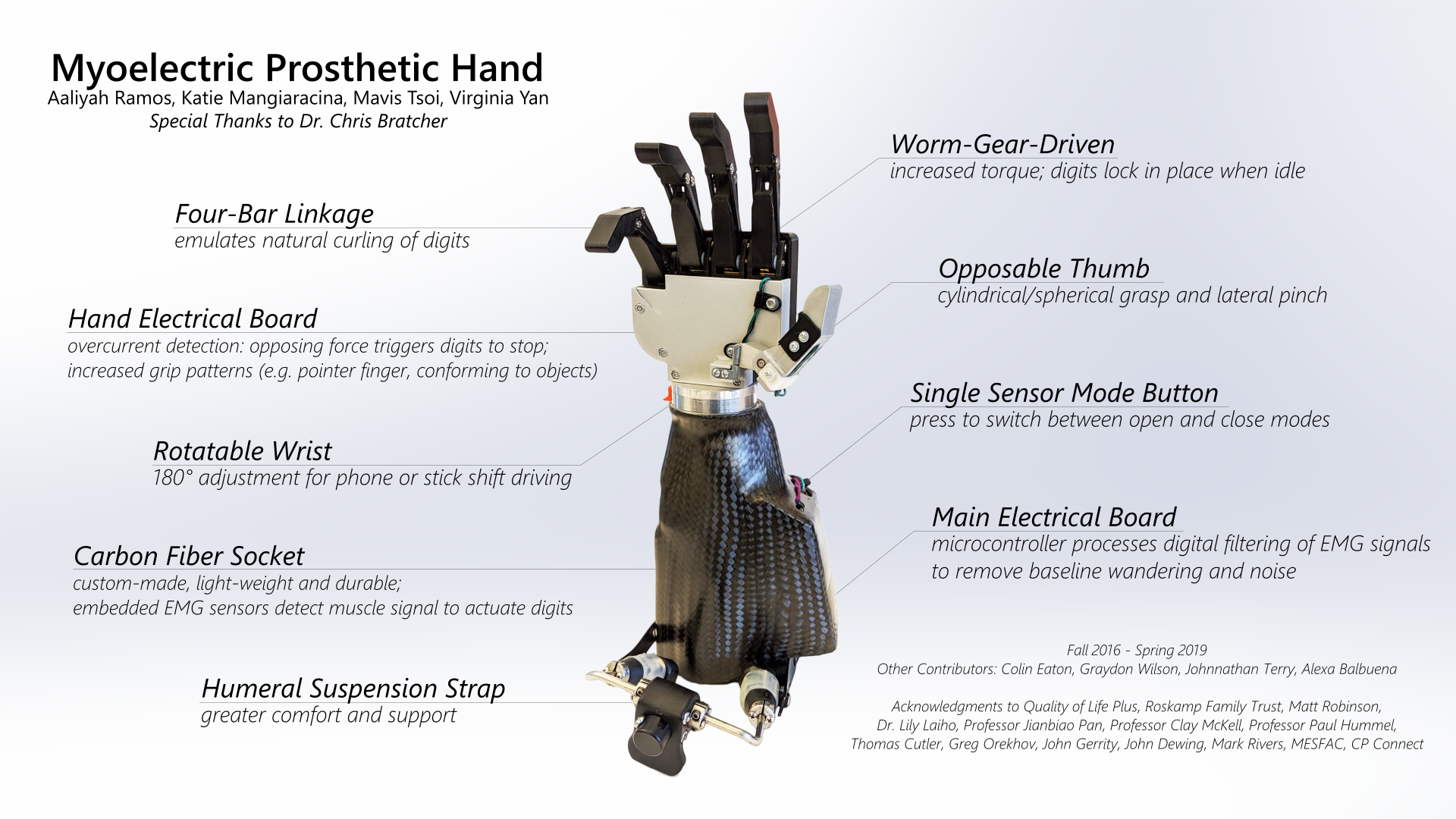 Quality of Life Plus Student AssociationAn EMG (electromyographic) signal-controlled prosthetic hand for Chris Bratcher, a winemaker who lost his dominant right hand to a winery accident. Safety control implemented via current sensing of DC motors. Signal acquisition, digital filtering, and finite state machine executed in C on ATxmega controller. Bratcher was able to hold bottles and plates, type, and carry bags successfully using wrist flexion and extension.